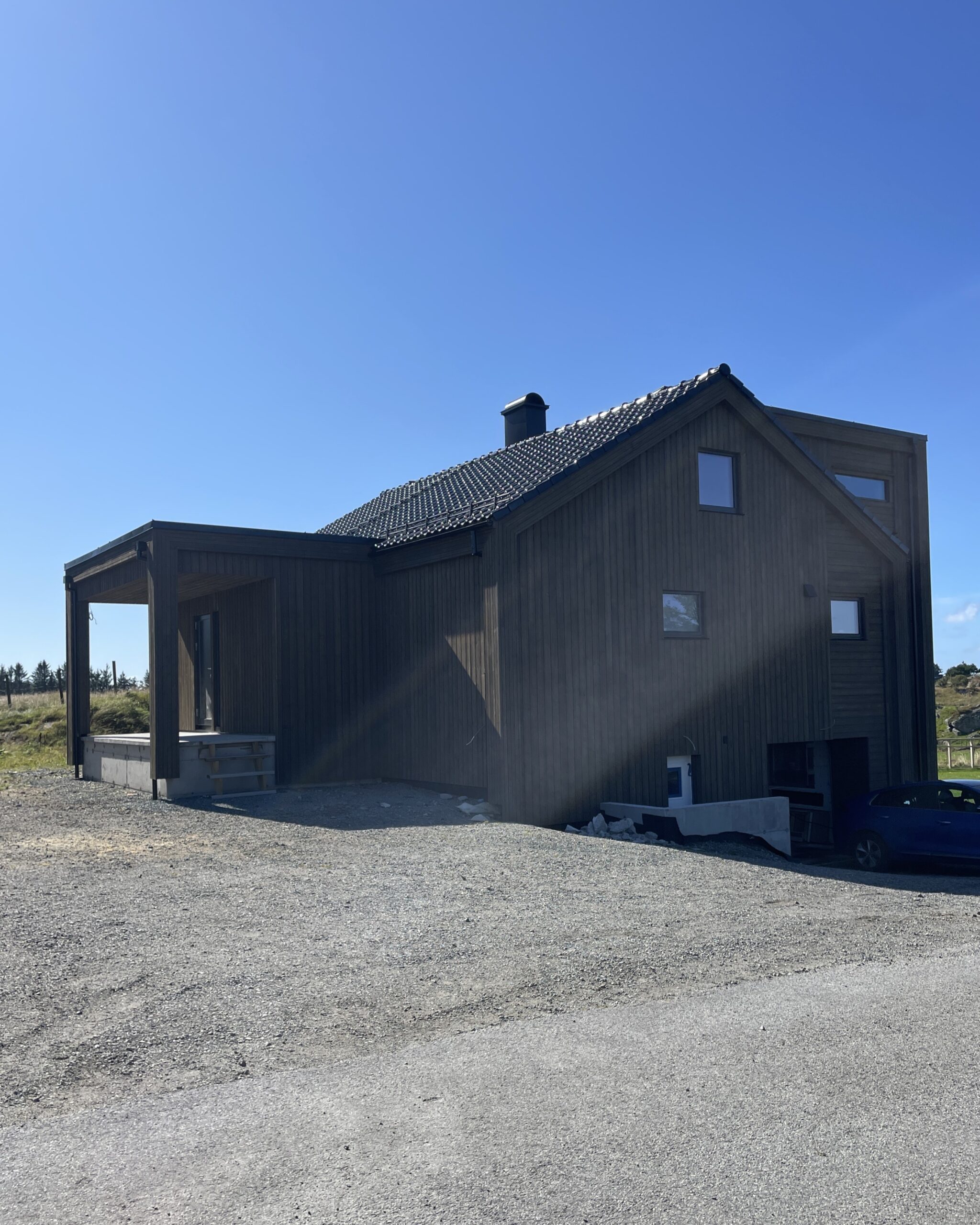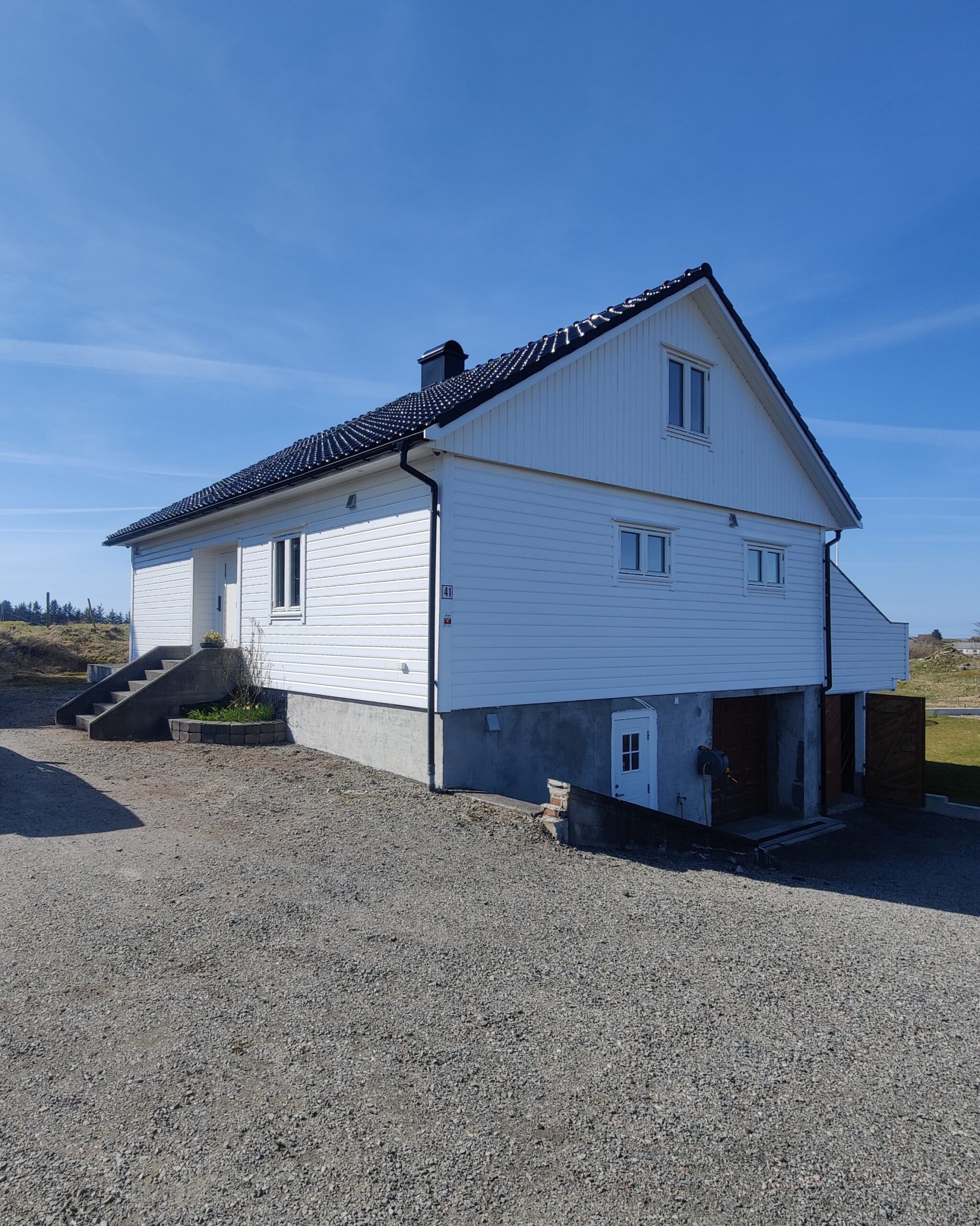 Etter. Endret til stående kledning for et moderne uttrykk, tilbygg for større plass og overbygget inngangsparti.